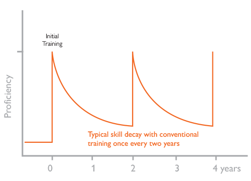 Research shows that healthcare providers’ skill retention declines as soon as three months after training. Most healthcare workers do not get the experience they need to maintain skills outside of infrequent training intervals.