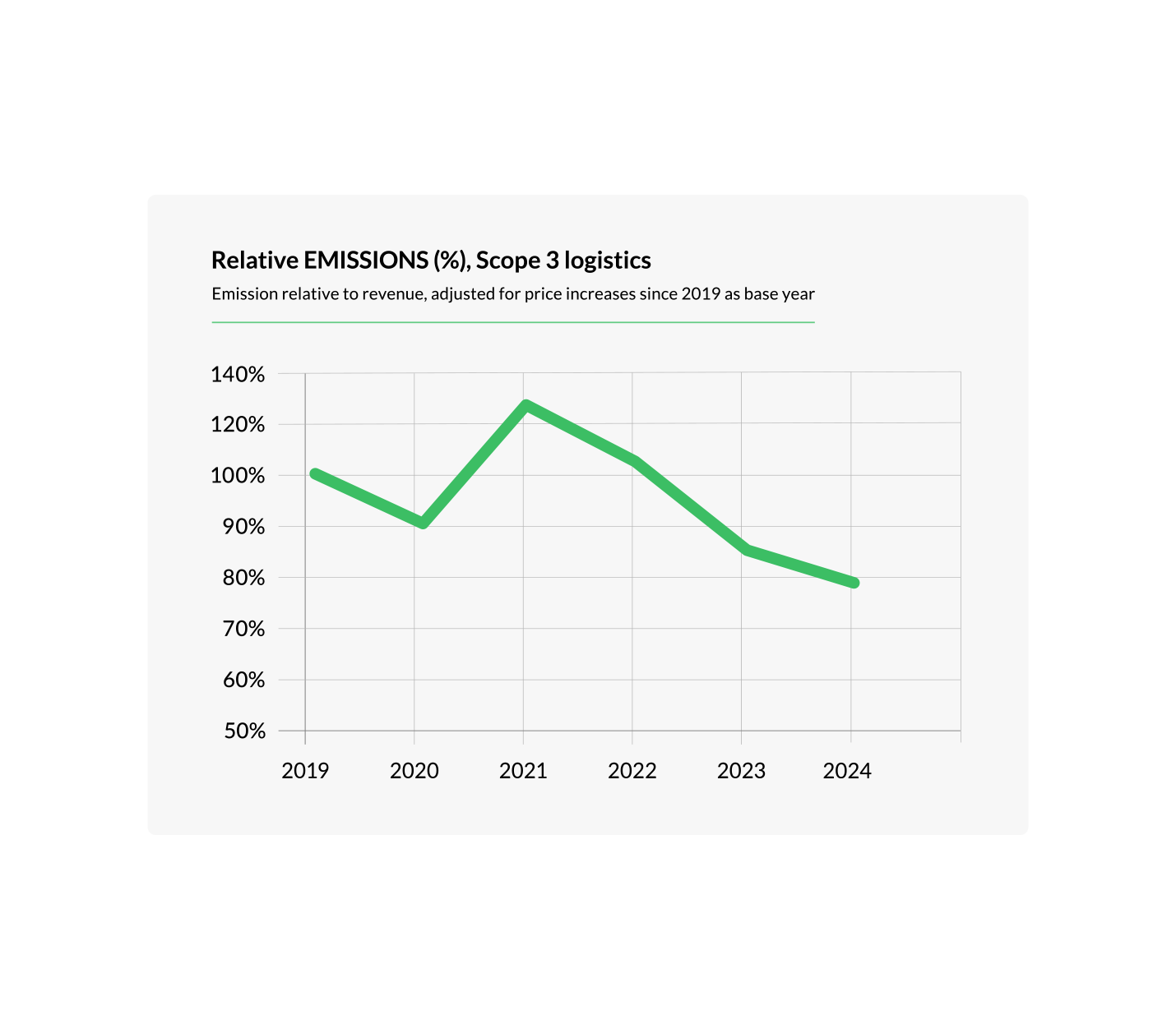We work closely with freight forwarders and shippers to identify and implement available solutions for reducing emission intensity. This includes utilizing fossil-free road transport and low-carbon ocean shipping between distribution centers, factories, and suppliers. We also optimize routing to ports closer to the main market, prioritizing train transport for the last leg of the journey.