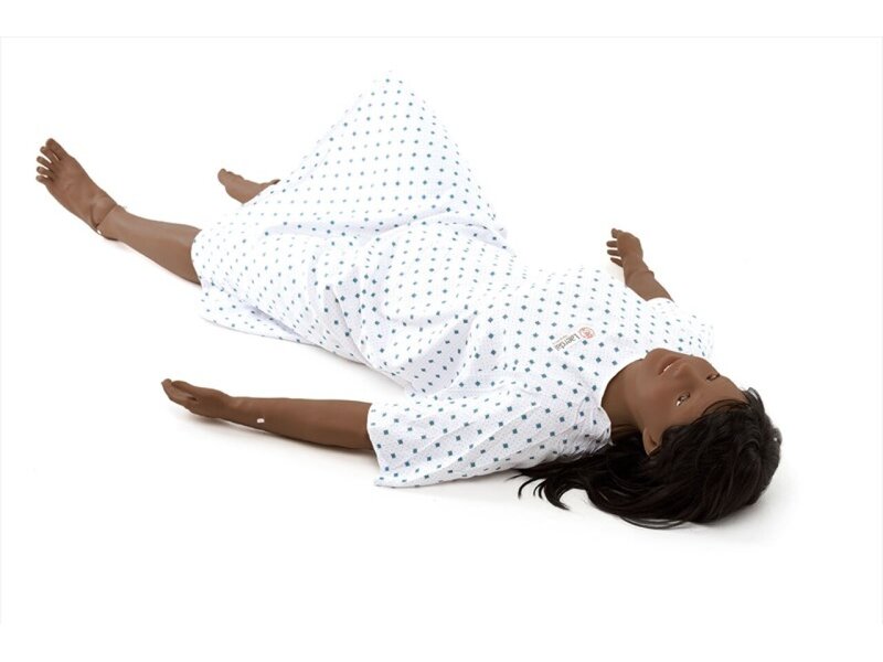 Full body, dark skin tone simulator with articulating arms and legs. Includes brunette wig, brown pupil set, ostomy set, blood pressure cuff, lubricant spray, simulated blood, a sample of silicone dressings, adult gown and quick setup guide.