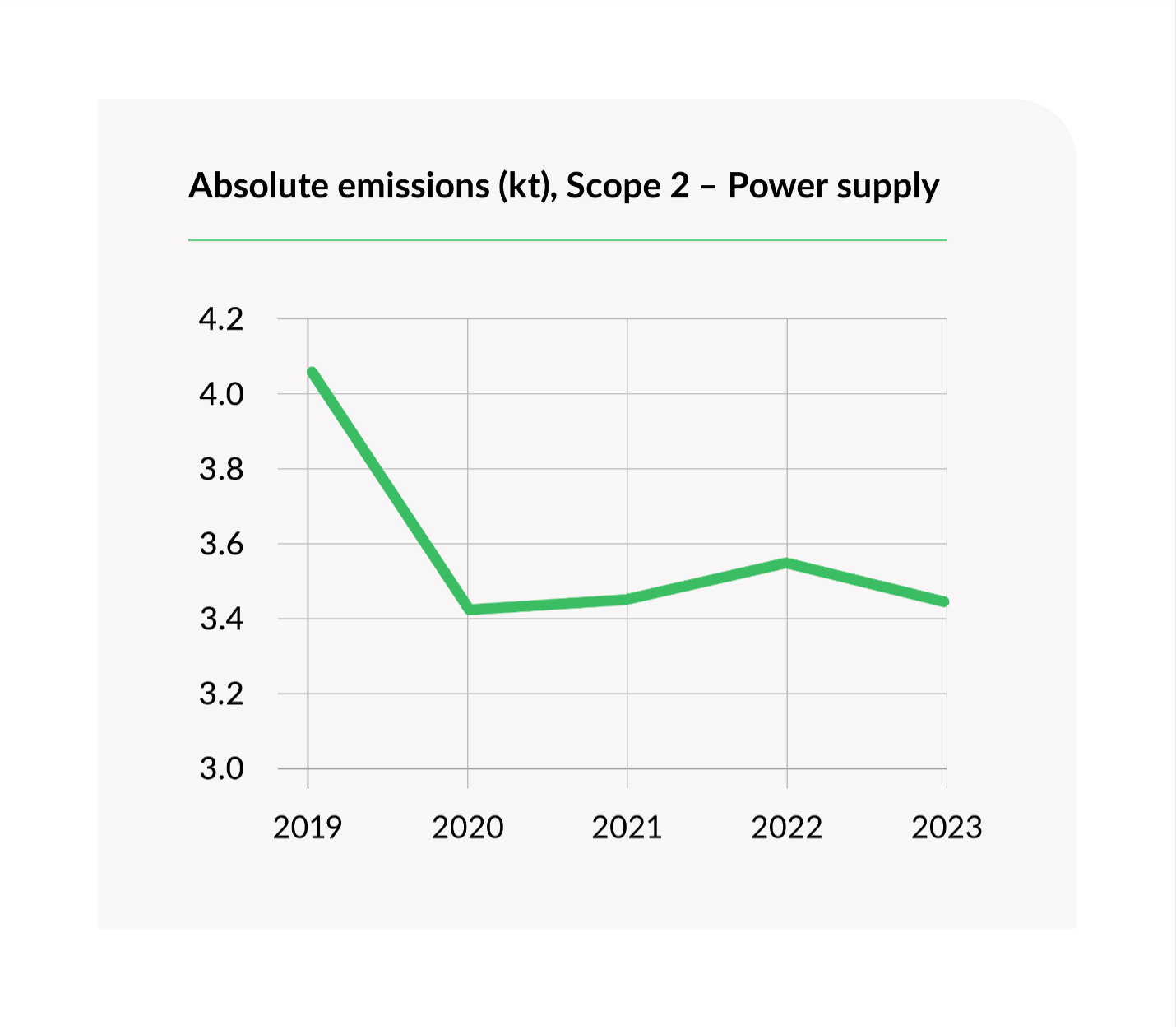 Nos émissions de scope 2 proviennent de la consommation d’énergie de nos opérations mondiales, réparties sur 26 bureaux de vente et quatre sites de production en Norvège, en Chine, au Mexique et aux États-Unis. La plupart des produits étant fabriqués à l’interne, nous maintenons une surveillance rigoureuse, garantissant des conditions de travail optimales et une gestion efficace des émissions liées à la production. Malgré une augmentation significative des volumes de fabrication depuis 2019, nous avons réussi à atteindre une réduction de 15,3 % sur la période. D’autres initiatives ont été lancées et devraient entraîner d’autres réductions au cours de la période à venir.