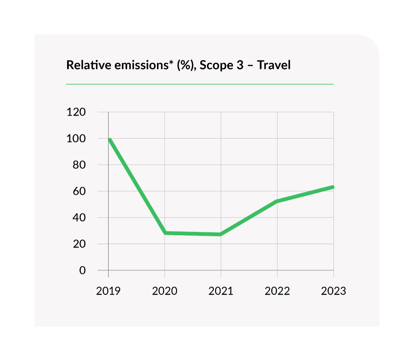 De 2019 à 2021, nos émissions de voyage ont considérablement diminué en raison de la pandémie de Covid. Les voyages ont augmenté en 2022, et encore en 2023, à mesure que les restrictions s’assouplissaient. Avec des opérations et des partenaires dans le monde entier, certains voyages d’affaires sont nécessaires. Cependant, la pandémie nous a incités à améliorer notre communication virtuelle entre nos entreprises et avec les clients, ce qui a permis d’accroître l’efficacité et de réduire les déplacements. Nous avons pour objectif d’effectuer au moins 80 % de nos services en ligne.