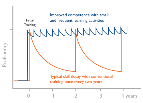 De nombreux professionnels de santé n’effectuent pas de RCP de façon régulière dans le cadre de leur pratique clinique et certains l'effectuent rarement en dehors de leur formation annuelle ou biannuelle (1). Des études ont démontré que les compétences acquises en réanimation cardio-pulmonaire se dégradent rapidement en l'absence de pratique, ce qui a pour effet une diminution globale de la qualité de la RCP. Ces compétences peuvent se dégrader moins de 3 mois après la formation (2).