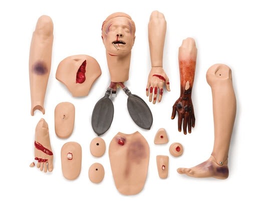 Sui manichini adulti per estricazione il set di moduli Trauma avanzati è intercambiabile coi moduli normali allo scopo di accrescere il realismo nel supporto alle funzioni vitali in presenza di traumi e negli scenari di pronto soccorso d'urgenza.