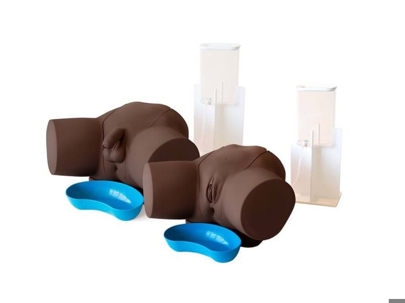 The Advanced Catheterization Trainer Set in dark skin tone, is designed for learning urinary catheterization techniques, including care for a pre-inserted suprapubic catheter for both female and male simulators. It mimics the feel of a catheter passing through the urethra into the bladder. Additionally, the trainer now includes Augmented Reality (AR) features for an enhanced learning experience.