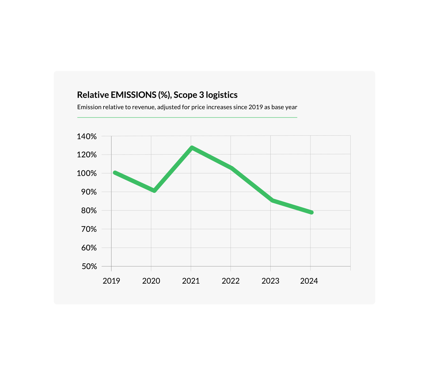 We work closely with freight forwarders and shippers to identify and implement available solutions for reducing emission intensity. This includes utilizing fossil-free road transport and low-carbon ocean shipping between distribution centers, factories, and suppliers. We also optimize routing to ports closer to the main market, prioritizing train transport for the last leg of the journey.