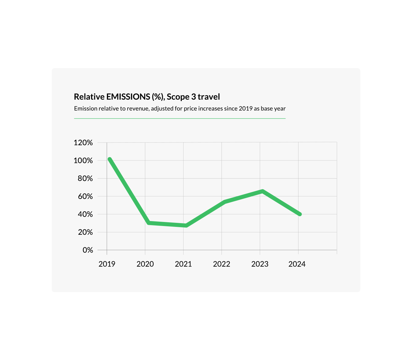 Travel-related emissions represented 21% of total emissions in 2019; in 2023, it was down to 16%. In 2024, it was further reduced and today accounts for 11% of total emissions.