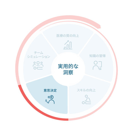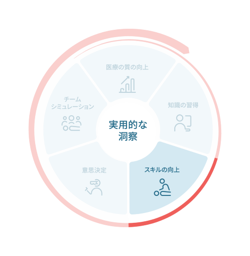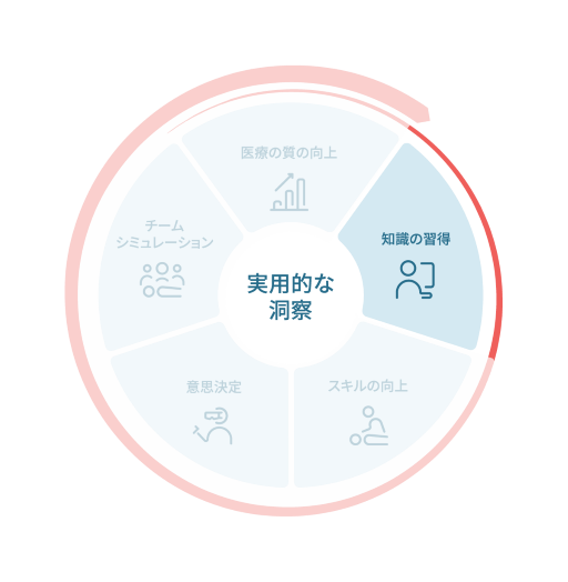 サークルオブラーニングをご使用になれば、医療教育の効率および効果を最大限に引き出す戦略を構築できます。サークルオブラーニングは5つのステップ(円を分割したセグメント)で構成され、各ステップは中央にある統合点でつながっています。視覚的には円のように見えますが、実際には、生涯学習と臨床改善に向けて進化し続けるらせん構造として機能することに着目してください。