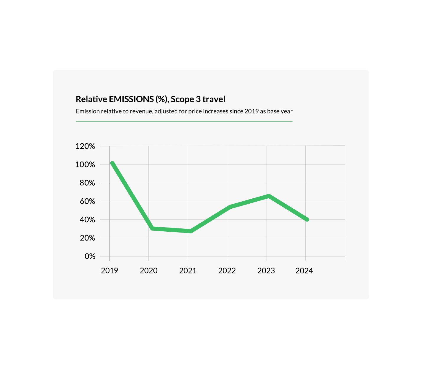 Travel-related emissions represented 21% of total emissions in 2019; in 2023, it was down to 16%. In 2024, it was further reduced and today accounts for 11% of total emissions.