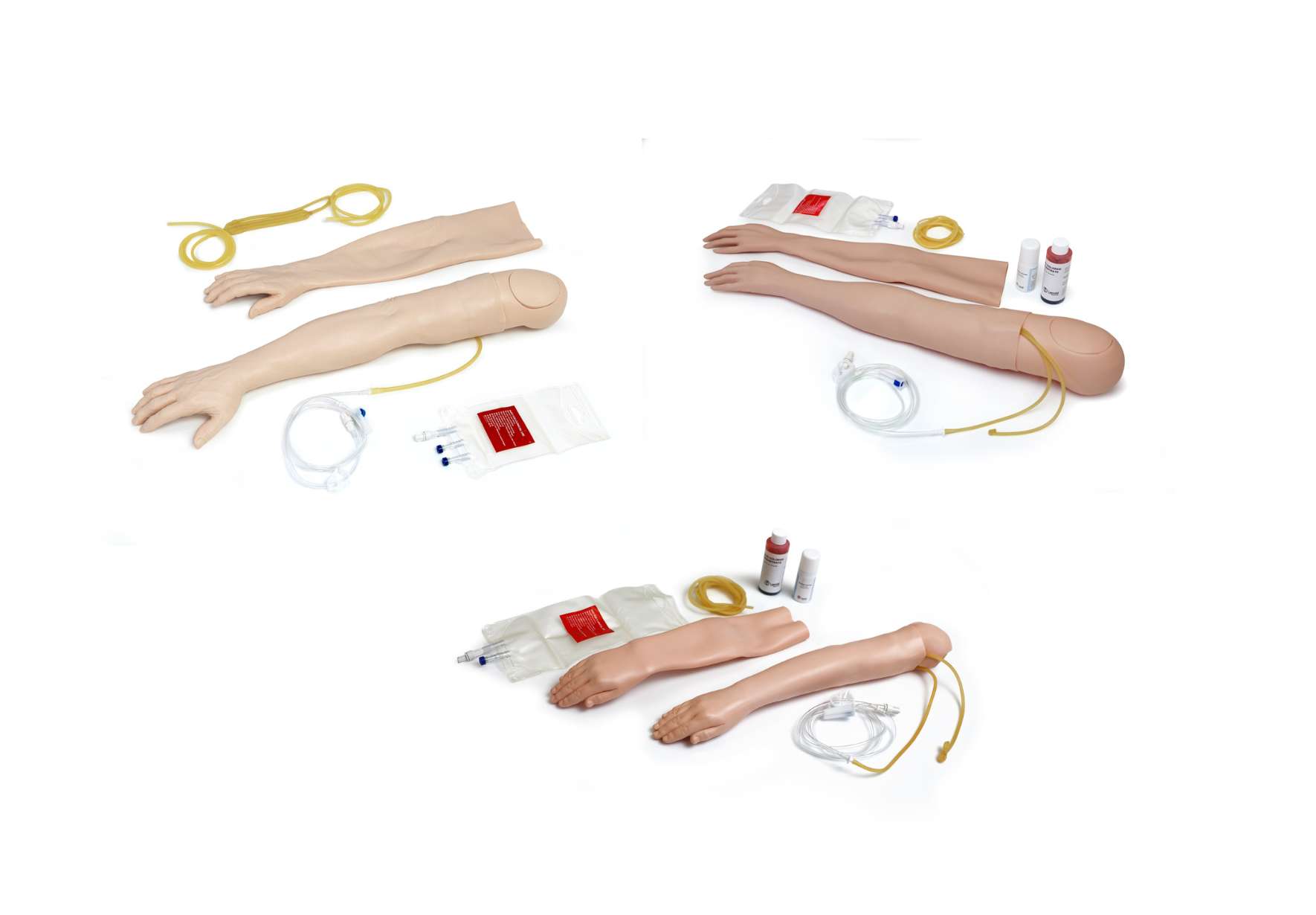 Reproducciones realistas de un brazo de adulto con piel y venas reemplazables, diseñadas para la terapia intravenosa periférica.