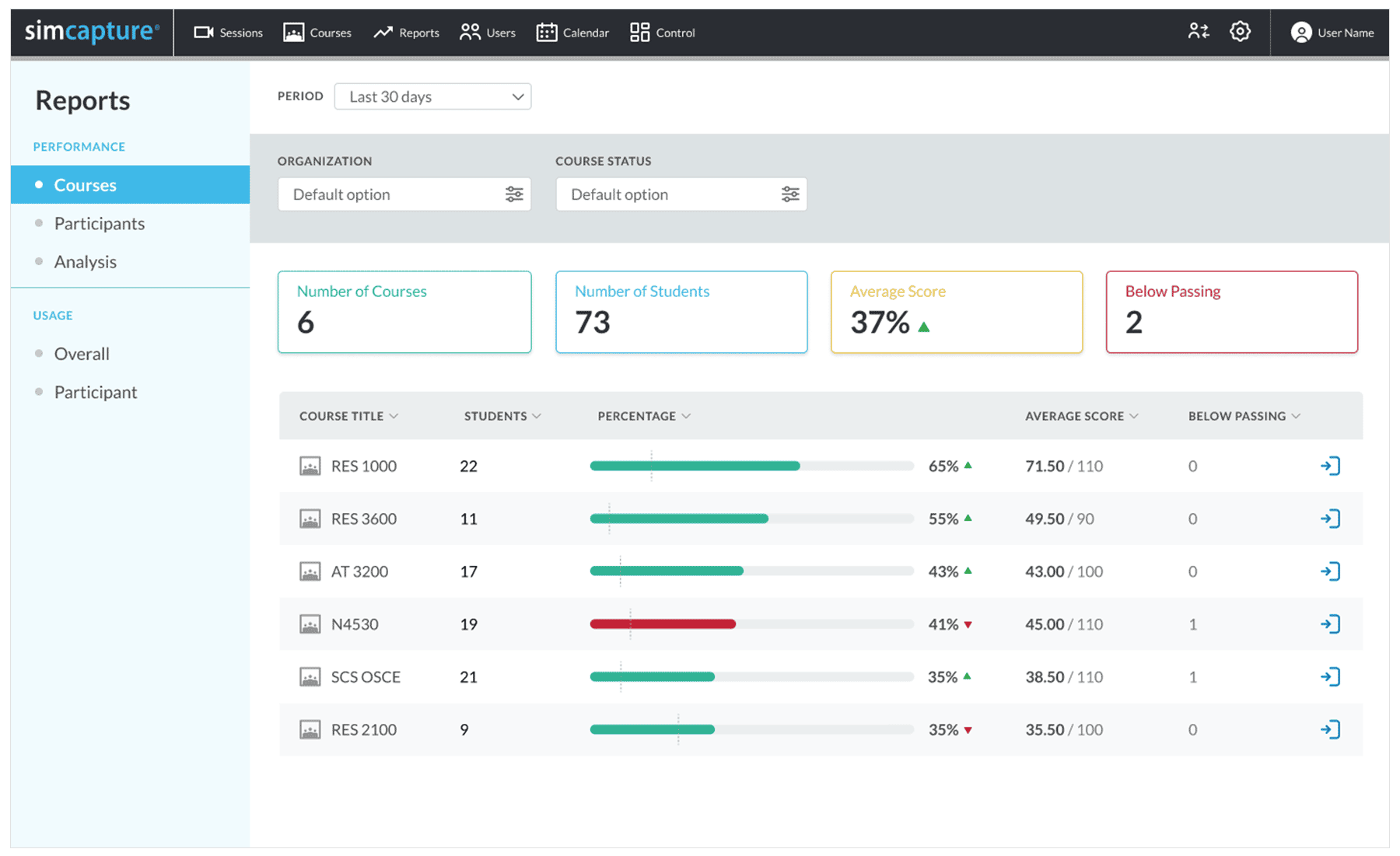 En tant qu'éducateur clinique, vous voudrez peut-être examiner les tendances des performances de l'apprenant dans le temps. Y a-t-il des domaines particuliers qui semblent problématiques ou qui se sont révélés difficiles au fil du temps ? Une tendance semble-t-elle avoir eu un impact sur un groupe, mais pas sur les autres ? Les fonctions de collecte de données et de reporting de SimCapture peuvent vous aider à suivre ces aspects de la performance et à produire des rapports à la demande.