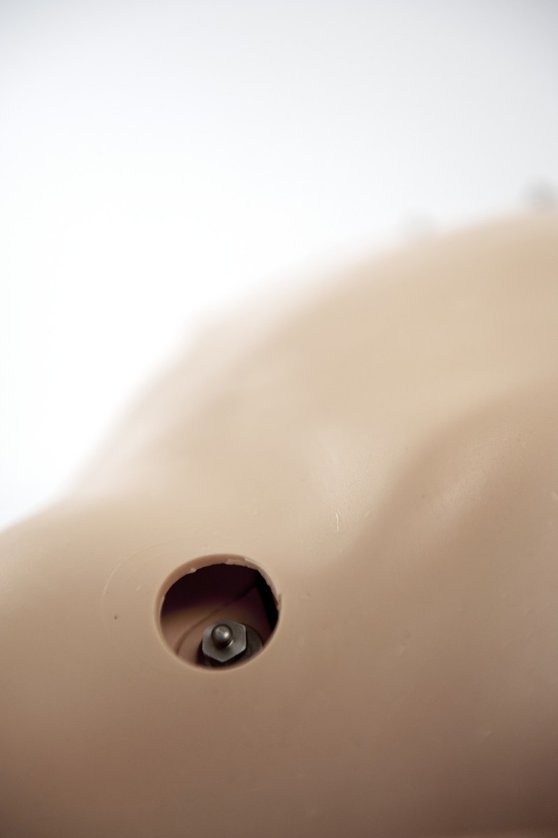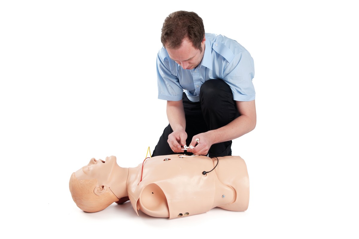 Adult male upper torso with anatomically accurate landmarks designed to realistically simulate airway management scenarios and train students in the proper utilization of 12 lead ECG devices, including the proper connection of patient cable, acquisition and interpretation of 12 lead ECG, and understanding and utilizing the AMI algorithm and local protocols relating to treatment of suspected or confirmed AMI.