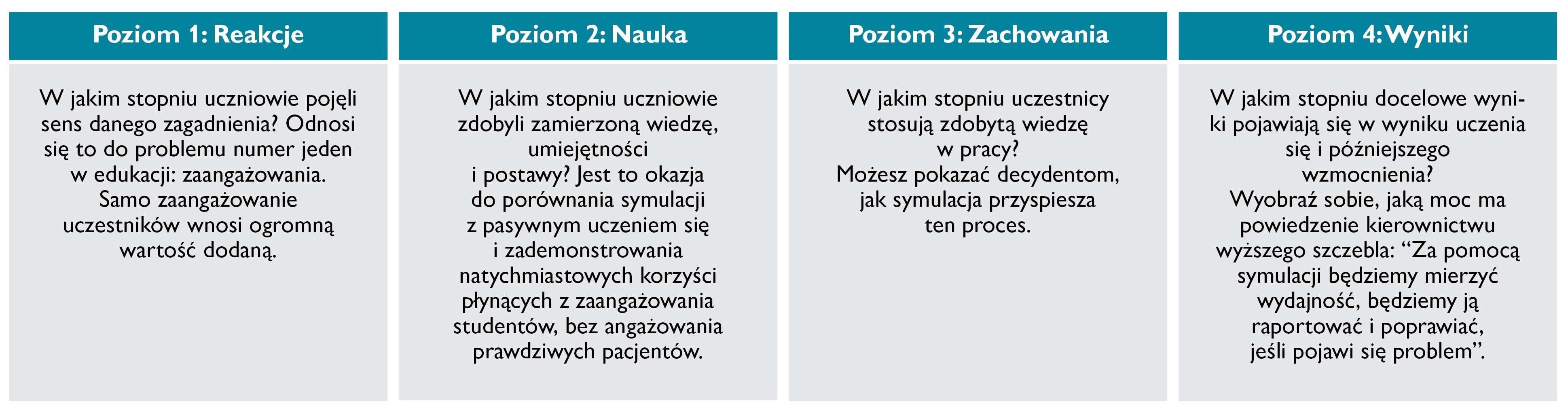 Eksperci od symulacji zdają sobie sprawę, że przekonanie do wdrożenia symulacji oznacza wykazanie zwrotu z inwestycji (ROI) - im szybciej, tym lepiej. Zazwyczaj odwołują się oni do modelu Kirkpatricka, aby wykazać, że szkolenie symulacyjne jest warte inwestycji: 3