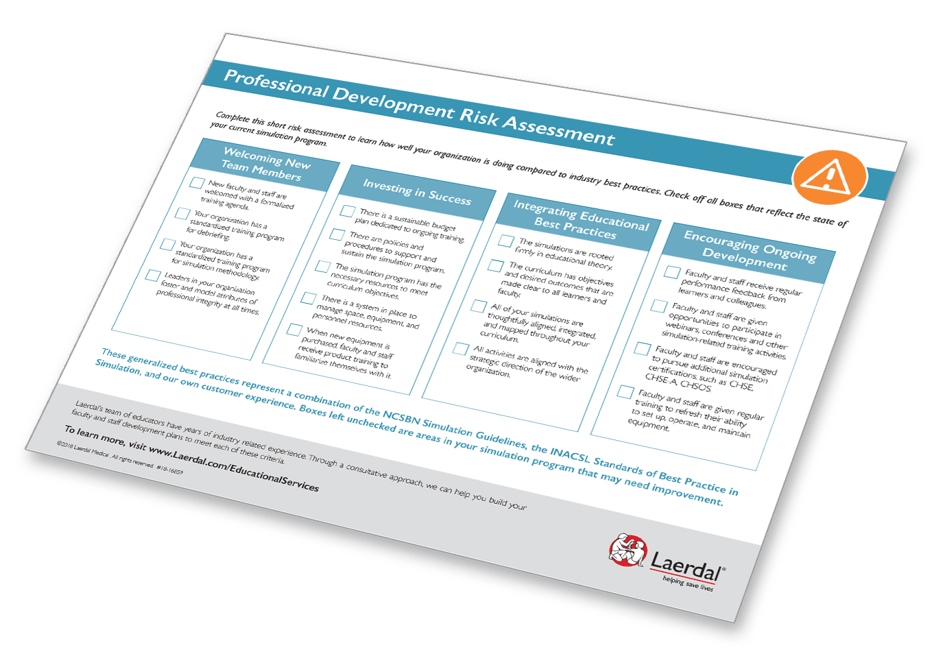 Once you've completed this assessment, you will be able to strategically focus on areas where improvement may be needed. Laerdal's team of educators have years of industry related experience. Through a consultative approach, we can help you build your faculty and staff development plans to meet each of these criteria.